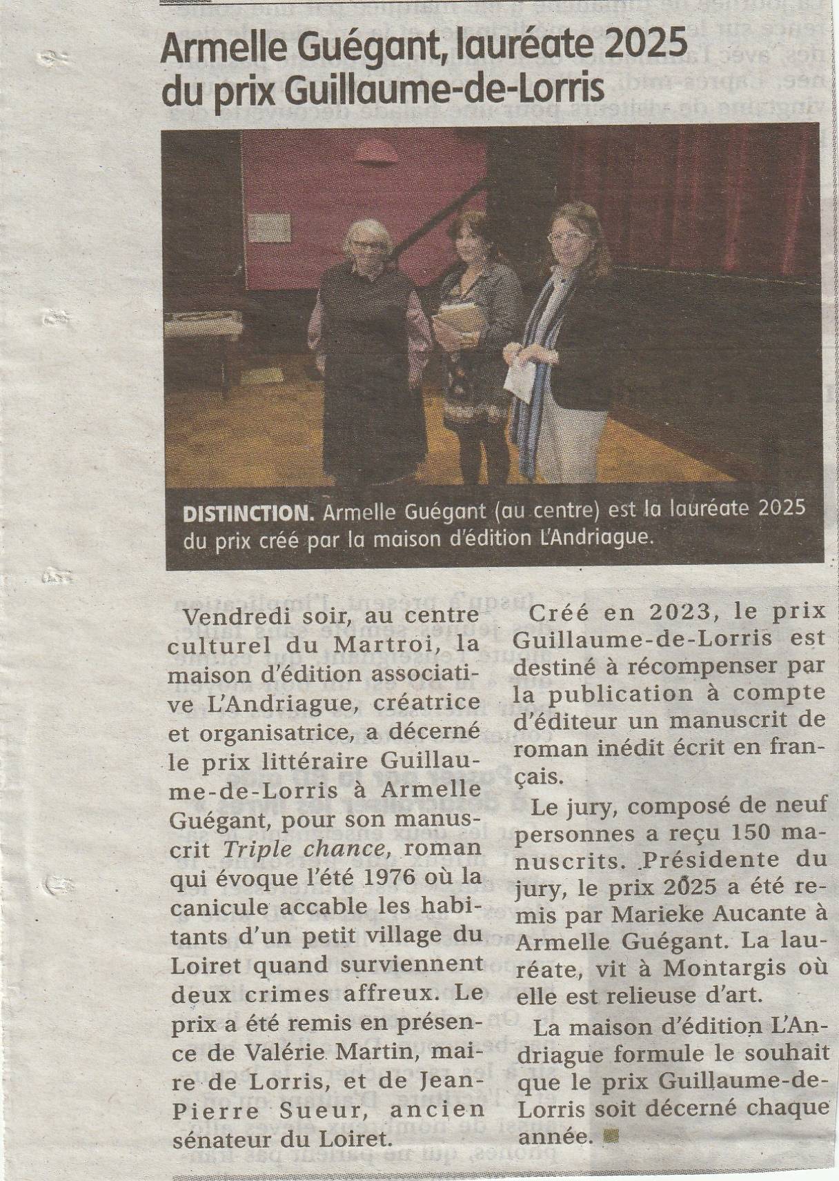 Lorris. Armelle Guégant, lauréate 2025 du prix Guillaume-de-Lorris